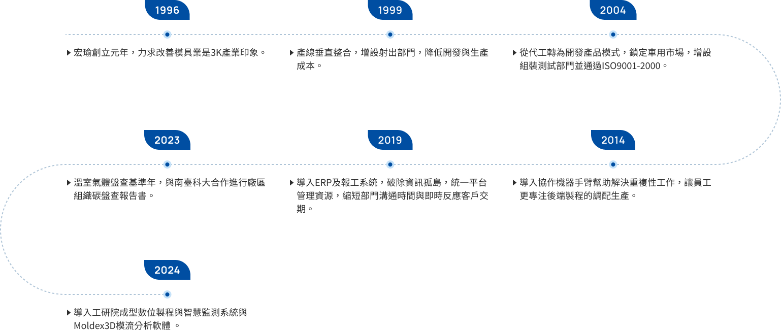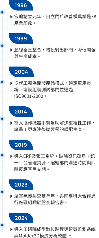 創立於民國85年,致力於汽車及其零件製造業、塑膠製品業、模具加工業等產業,現為卡車AM市場的供應商之一,專業營業項目包含模具開發設計製造、射出成型 、卡車用電子(電磁閥、感測器、副水箱、懸吊系統)等。